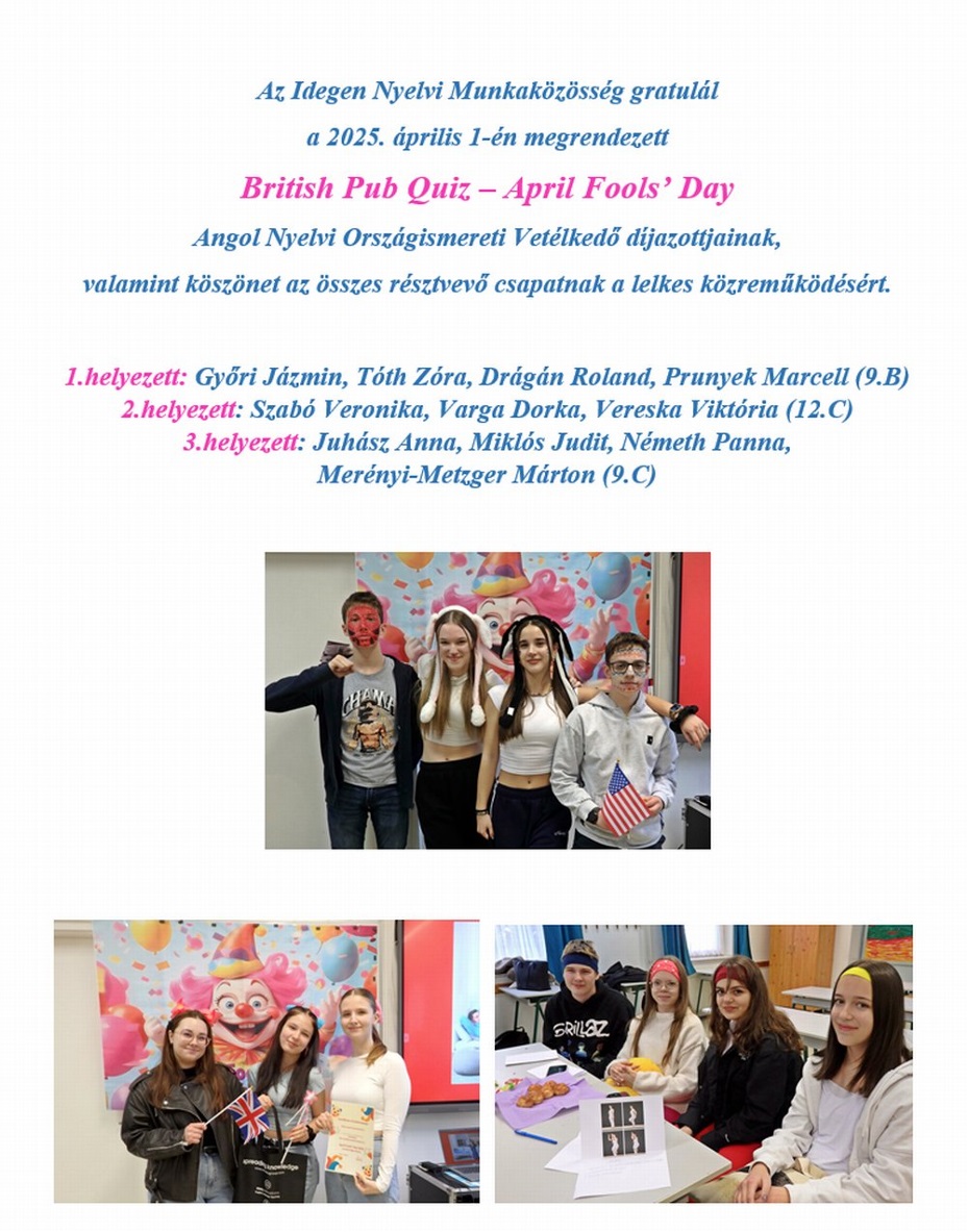 „A Tourists csapat vagyunk, az Erkel Ferenc Gimnázium 10.A osztályos tanulói. Nagyon szerencsések lehettünk, hogy részt tudtunk venni a Great British Pub Quiz versenyen a 2022-es tanévben. A kérdések és feladatok izgalmasak, a közösség baráti volt. A hangulat és a dekoráció elvarázsolt minket. A süteményektől és az üdítőktől a hely otthonossá vált. Kreatívnak találtuk az utolsó, mozgásos feladatot. Ráeszméltünk, hogy melyikünk, melyik quiz feladatban állja meg legjobban a helyét. A verseny végén azonnal megtudtuk, hogy csapatunk a második helyezést érte el. Nagyon hálásak vagyunk nyelvtanárainknak ezért a remek élményért, az ajándékokért és az „alamizsna” süteményekért a verseny vége után.”